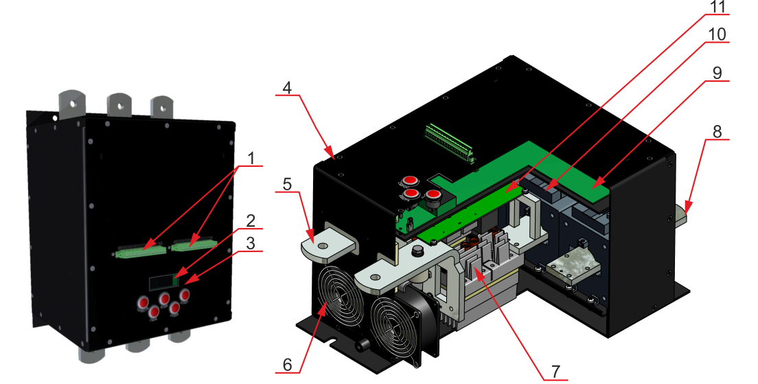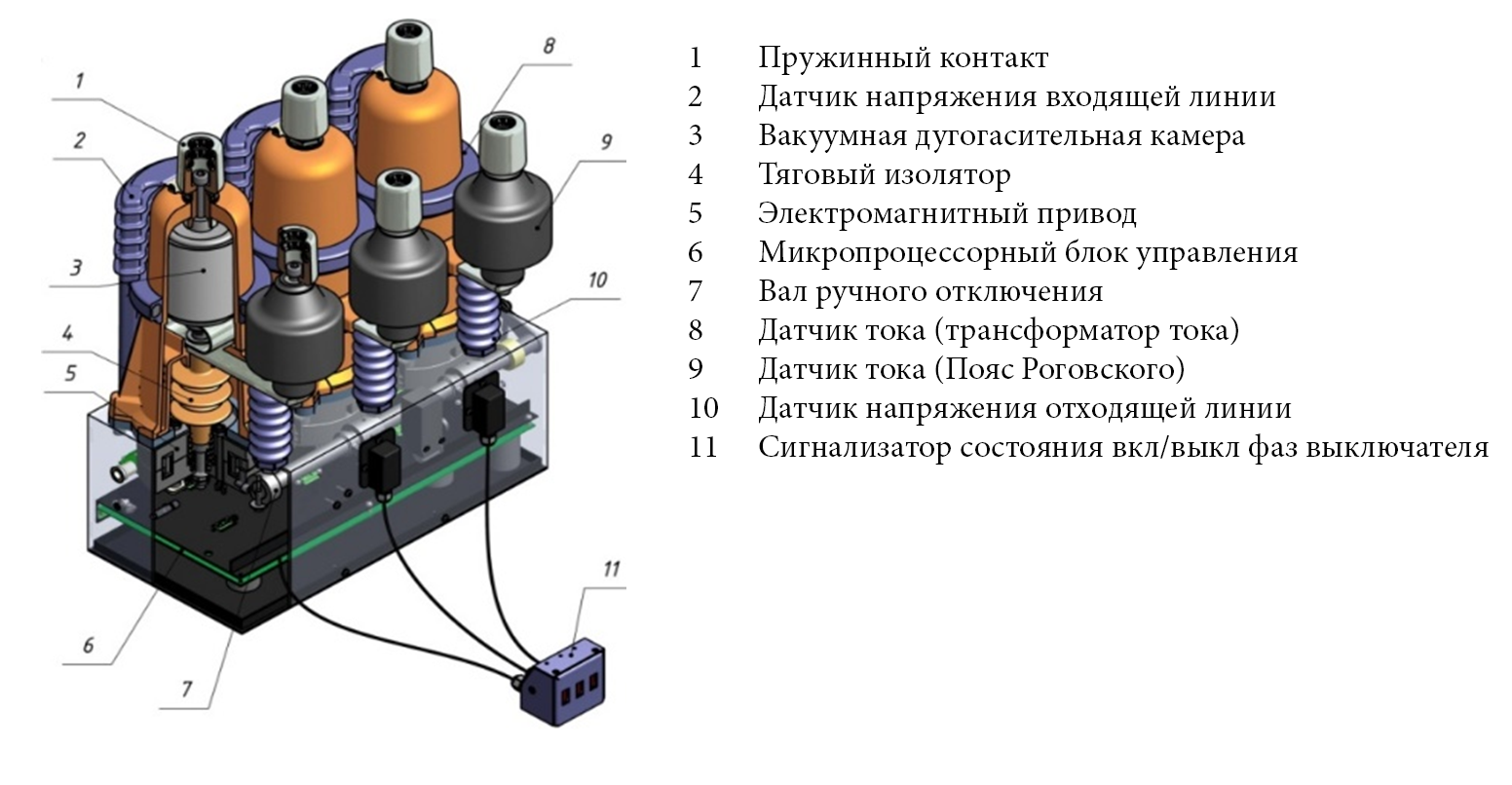 Трехфазный вакуумный выключатель - единый мехатронный модуль с пофазными управляемыми электромагнитными приводами, выполняющиеся с магнитной защелкой (или без), интегрированный в микропроцессорный блок управления, датчиков обратных связей по токам и напряжениям.